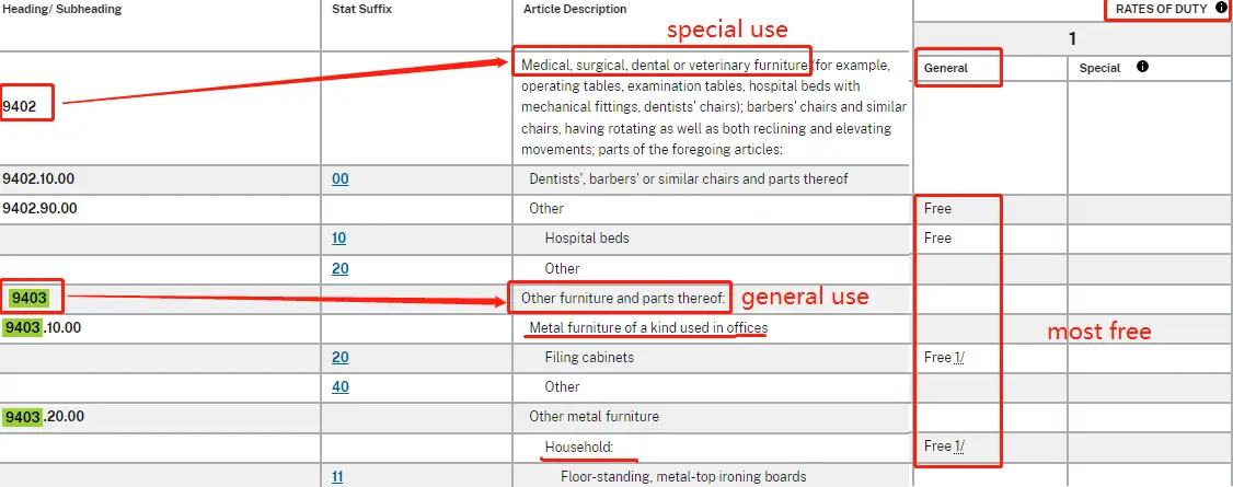 As you can see, current US duties for most general-use furniture items are free. However, be aware that importing wooden bedroom furniture from China, like wooden headboards and nightstands, may incur anti-dumping duties, sometimes as high as 200%. The safest way is to ask your customs broker for exact duty rates.