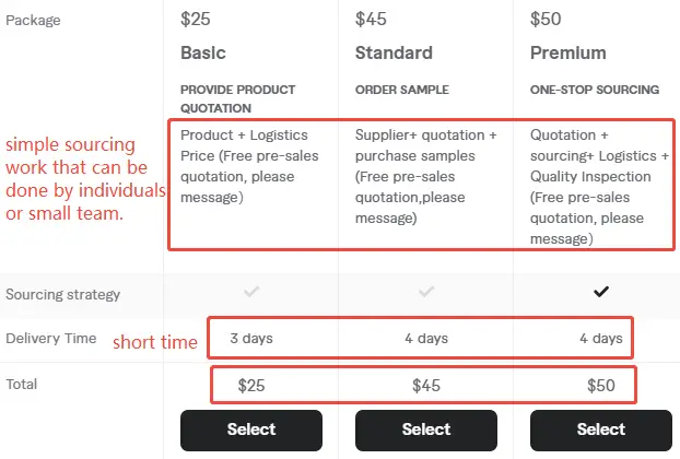 Small sourcing agents (1-10 people) often charge fixed pricing per package or hour, usually one-time and simple sourcing services: