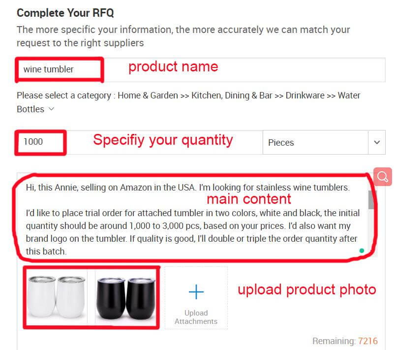 In this section, we’ll show you how to develop quality RFQs through a real case. Talking with our friend Anna, an Amazon Seller in the USA, she’s willing to share her RFQ experience. Once she was looking for stainless wine tumblers and she’d like to post an RFQ to collect quotes. As Anna told us, she received 10 quotes within just 10 mins; below is how she started her story.