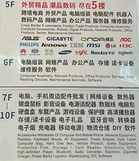 - SEG Electronics Market (赛格电子市场) — located on the 1st to 10th floor of SEG Plaza (赛格广场), it covers all kinds of electronics and components.