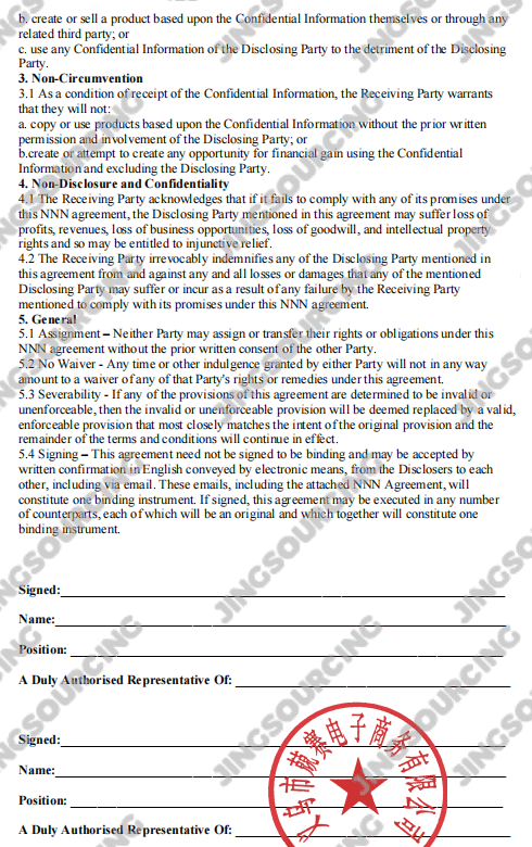 What I suggest here is to evaluate and find a reliable Chinese supplier. Because responsible suppliers won’t share your product info with others or use it for reselling. They will take the NNN agreement seriously. At the same time, they’ll select trustworthy upstream suppliers, and sign Chinese-version confidentiality agreements (CA), just in case of any disclosure or commercial use of your product.